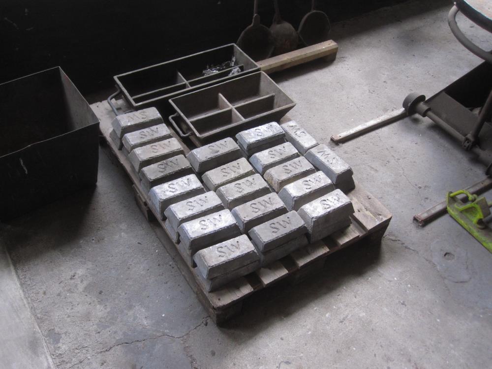 Daneben haben die Aktiven einen Gießofen aufgestellt. Dieser ursprünglich aus Salzwedel stammende Ofen diente dazu, Weißmetall zu verflüssigen, das dann zu Lagerschalen für die Achsen und Antriebsstangen von Lokomotiven gegossen wurde. Der Ofen wurde mit Heizöl befeuert. Die Bilder zeigen einerseits Lagermetall in Barrenform, andererseits den Gießofen.