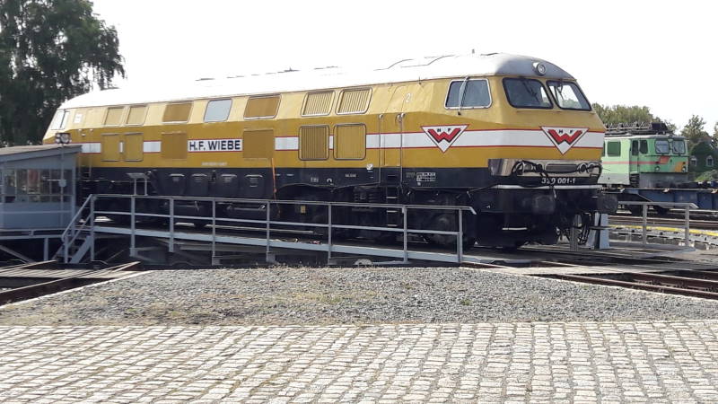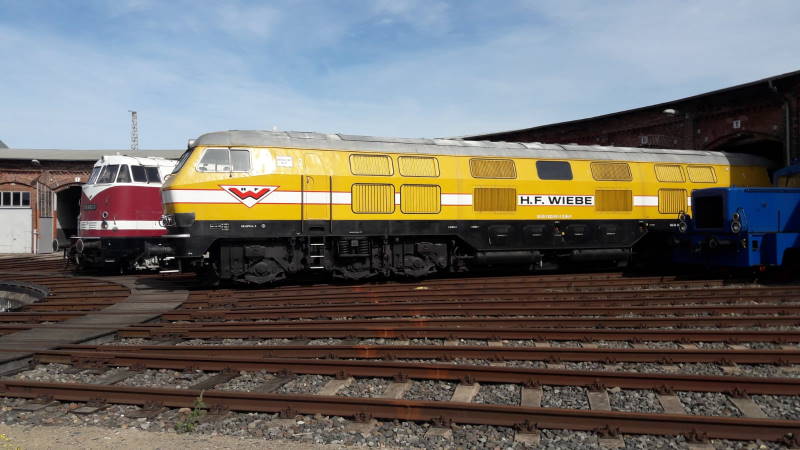 In der Nacht vom 18. zum 19.9.2020 erreichte ein neues Exponat das Museum. Es handelt sich um die größte nach dem Krieg in Deutschland gebaute Diesellokomotive. Sie wurde bei der Firma Henschel in Kassel hergestellt und 1962 bei der Deutschen Bundesbahn in Betrieb genommen. Mit ihren zuletzt 3.800 PS beförderte sie schwere Personenzüge zunächst von Hamm in Westfalen aus, später im Allgäu. Die Lok blieb ein Einzelstück und wurde 1974 an den Hersteller zurückgegeben. Von dort aus wurde sie an die Hersfelder Kreisbahn verkauft, 1989 an die Teutoburger Waldeisenbahn. Von 1994 bis 1998 gab sie ein Gastspiel in Italien und kehrte dann wieder nach Deutschland zurück. Hier erwarb sie die Gleisbaufirma Wiebe, die sie bis 2015 einsetzte, als sie einen Achslagerschaden erlitt. Von 2017 bis 2020 kehrte sie an ihren Entstehungsort zurück und war bei der Firma Bombardier, der Nachfolgerin der Firma Henschel, hinter verschlossenen Türen abgestellt. Nachdem die Lok jetzt an den Eigentümer zurückgegeben wurde, entschied sich dieser, die Lok dem Historischen Lokschuppen Wittenberge als Ausstellungsobjekt zur Verfügung zu stellen. Die folgenden Bilder zeigen die Lok unmittelbar nach ihrer Ankunft in Wittenberge.
