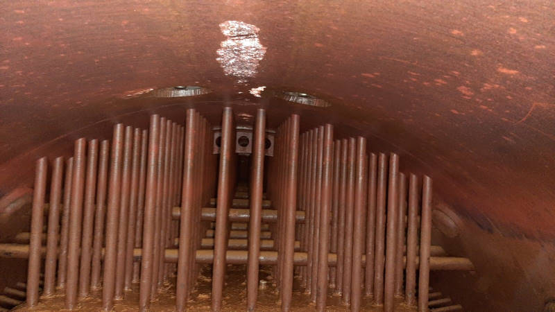 Dabei gelangen auch seltene Anblicke aus dem Inneren des Kessels. Das folgende Bild zeigt die sogenannten Deckenanker. Dabei handelt es sich um die langen Metallstäbe, an denen die Feuerbüchse im Kesselinneren befestigt ist.