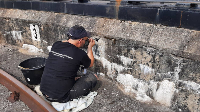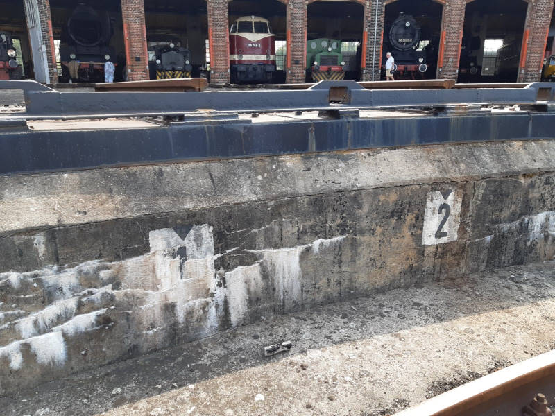 Ein Kollege wollte lieber das schöne Wetter außerhalb des Lokschuppens genießen. Er erbarmte sich der in der Drehscheibengrube angebrachten Markierungen für die Gleisbezeichnungen im Lokschuppen. Diese waren im Laufe der letzten Jahre schon etwas verwittert. An diesen Markierungen kann sich der Drehscheibenbediener orientieren.