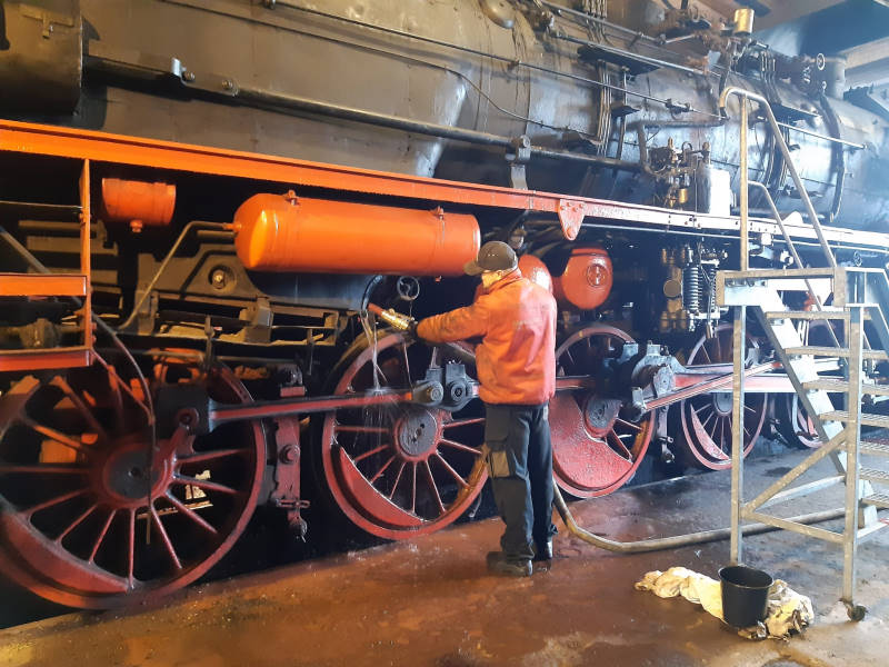 Danach wurde die Lok wieder zurück in den Schuppen gefahren und der Kessel ausgewaschen. Das ist von Zeit zu Zeit nötig, weil sich der im Kesselwasser enthaltene Kalk an den Wänden und den Rohren im Kessel absetzt und zu Schäden führen kann, wenn die Ablagerungen zu dick werden. Deswegen müssen die Kessel unserer Dampflokomotiven mit Hochdruck gespült werden.