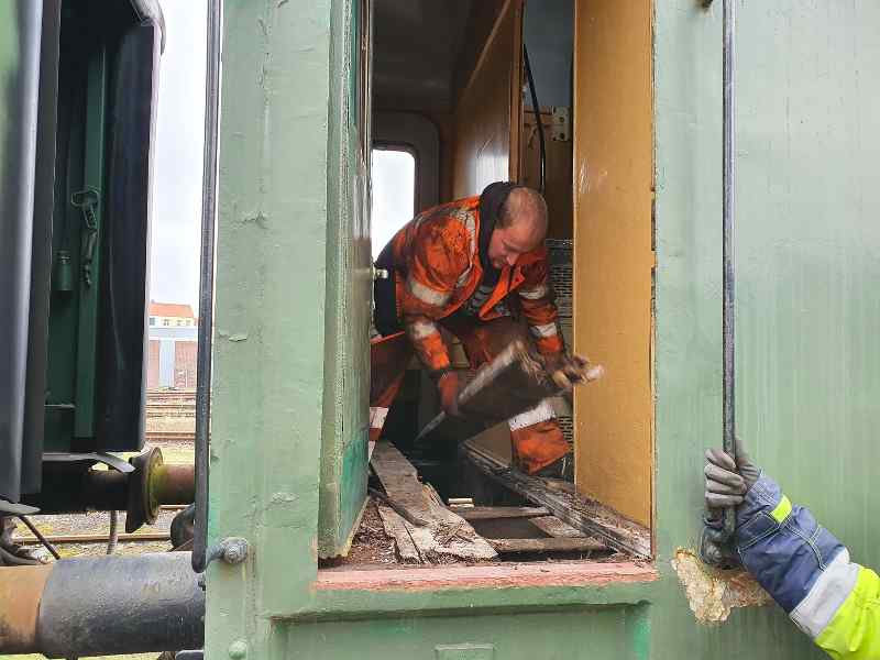 Daneben wurde der Fußboden unseres Packwagens Pwg im Einstiegsbereich entfernt, weil dieser durch eindringende Feuchtigkeit leider etwas gelitten hat.