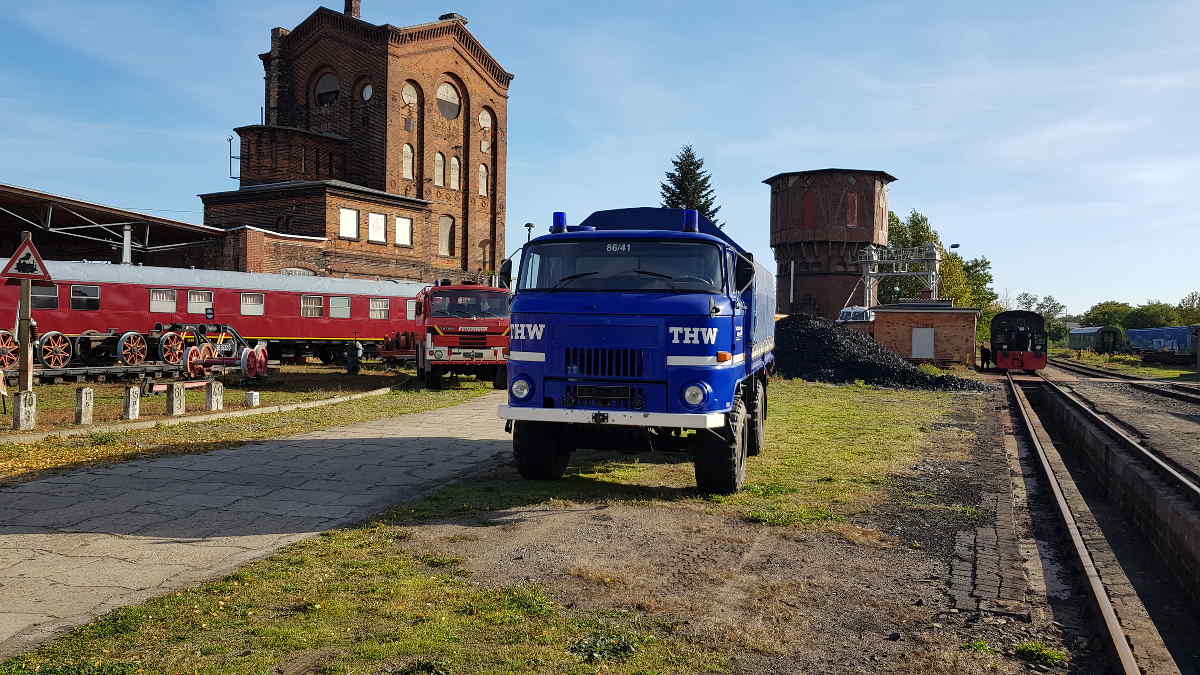 Dann wurden die Exponate des Blaulichtmuseums in Beuster auf der anderen Elbeseite aufgestellt. Die Kollegen waren mit einem IFA L60 in der Lackierung des Technischen Hilfswerks und einem Tankwagen der Feuerwehr auf unserem Gelände präsent. Außerdem wurde ein schienengängiger Traktor der Reihe Fortschritt ZT-320 aus dem Traktorenwerk Schönebeck aufgestellt