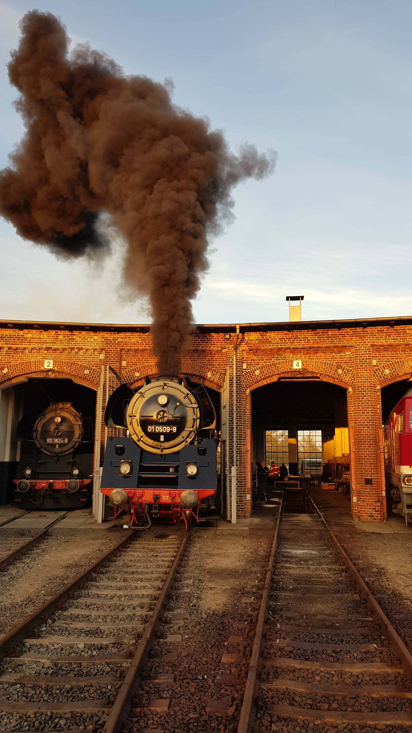 Am späten Nachmittag hatte der Kessel unserer Dampflok 50 3570 schließlich Betriebsdruck erreicht. Dann wurden unsere Lok an die Dampflok 01 0509 gekuppelt, die der Firma Pressnitztalbahn gehört. Das war notwendig, weil letztgenannte ölgefeuert ist und zum Aufwärmen des Bunkeröls und zum Betreiben der lokeigenen Ölbrenner externe Starthilfe benötigt.