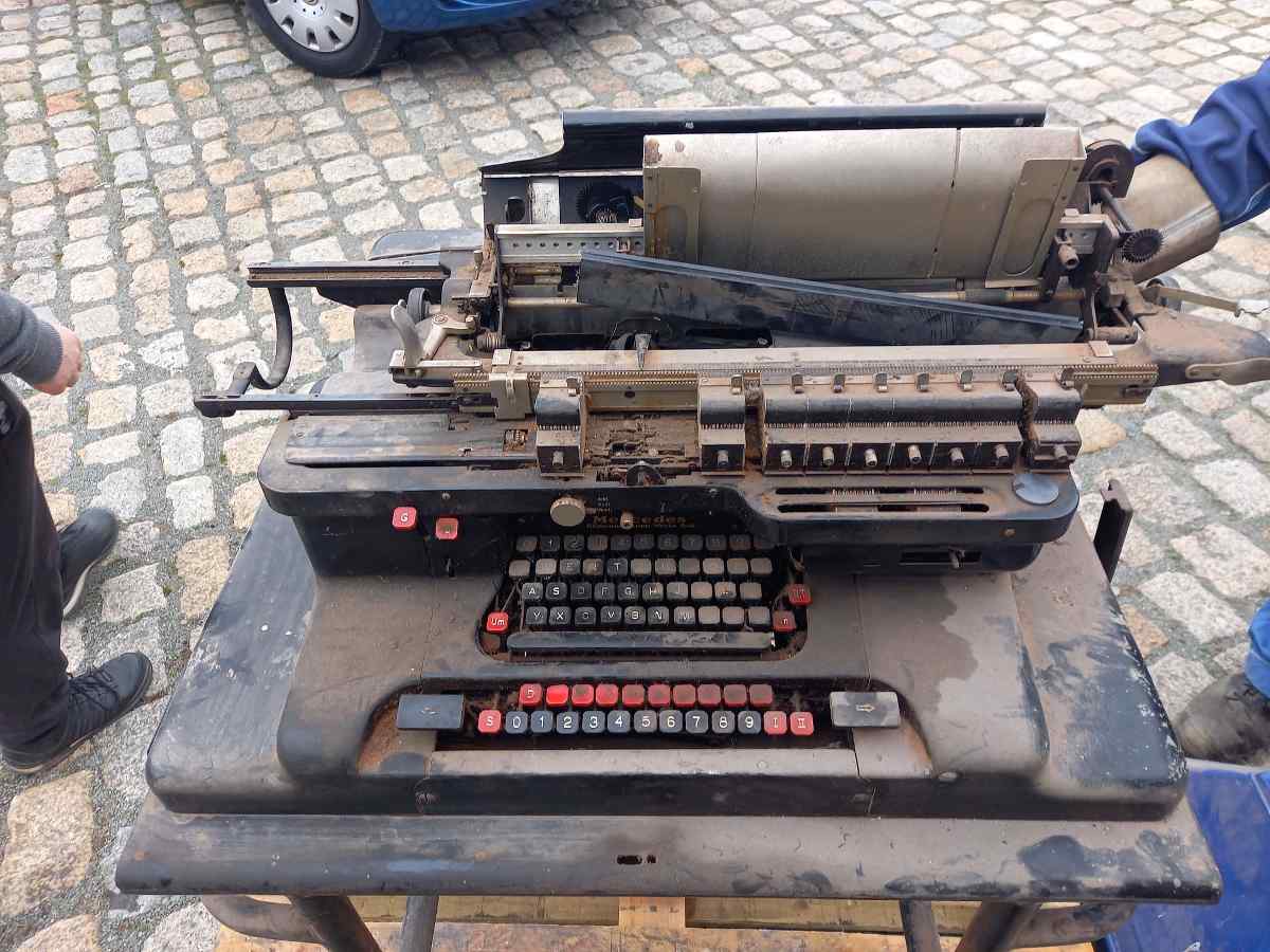 Bereits im Laufe der vergangenen Woche haben wir einen Kellerfund aus Hamburg erhalten. Wir ermitteln noch, worum genau es sich handelt. Wir vermuten, dass es sich um eine sogenannte Buchungsmaschine handelt, mit der man Buchungsbelege und Konten beschriften konnte, die vor dem Computerzeitalter in Papierform geführt wurden. Die Maschine muss zwischen 1937 und dem Kriegsende von der damaligen Reichsbahndirektion Hamburg angeschafft worden sein. Diese Direktion war als vorgesetzte Dienststelle auch für das Bahnbetriebswerk Wittenberge zuständig. Ersten Recherchen zufolge muss sie bei der Firma Mercedes-Bureau-Maschinen GmbH in Zella-Mehlis hergestellt worden sein. Diese Firma existierte später unter dem Namen VEB Cellatron Büromaschinenwerk weiter und wurde 1977 in das Kombinat Robotron eingegliedert (Quelle: Wikipedia).