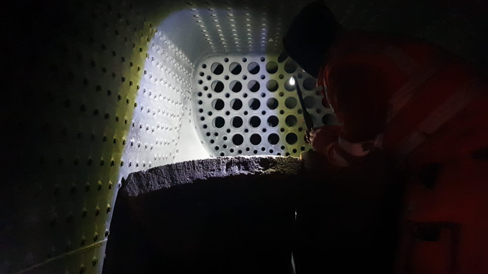 Und um sicherzugehen, dass auch nicht die kleinste Undichtigkeit am Kessel besteht, ist ein Kollege in die Feuerkiste gestiegen und leuchtet die Rohrwand ab. Zum Glück läuft aus keinem der Rohre Wasser.
