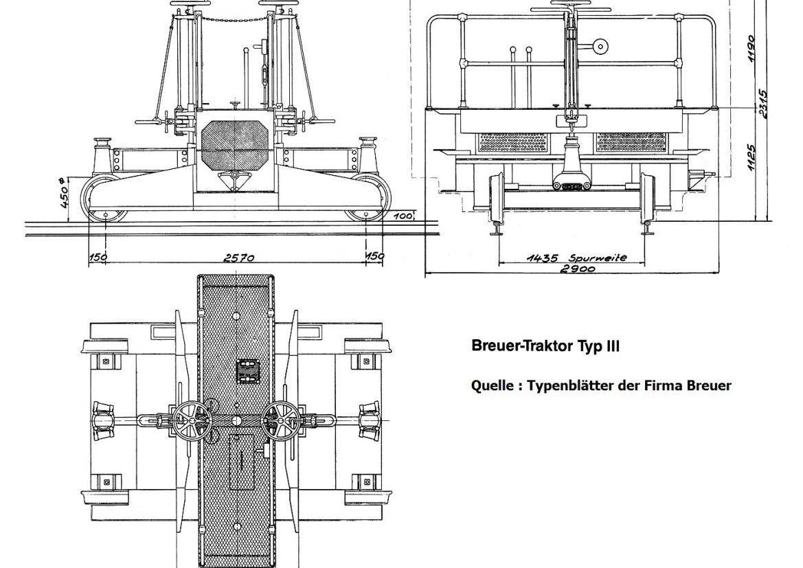 Die Welt hat ja bereits einige interessanten Eisenbahnfahrzeuge gesehen. Zu den eigenwilligsten gehört sicher unser Breuer Rangiertraktor, der für den Verschub von Güterwagen in sehr beengten Platzverhältnissen gebaut wurde. Fahrzeuge dieser Art wurden insbesondere in Industriebetrieben eingesetzt, bei denen die Güterwagen über kurze Drehscheiben auf Gleise gedreht wurden, die in Werk- oder Lagerhallen führten. Der Einsatz dieser Drehscheiben ersparte den Einbau von Weichenverbindungen. Diese Drehscheiben waren jedoch häufig nur wenig länger als ein zweiachsiger Güterwagen. Verschob man die Wagen zunächst mit Muskelkraft, so machten höhere Gewichte der Wagen jedoch den Einsatz von motorisierten Hilfsmitteln notwendig. Deshalb entwickelte die Firma Breuer in Höchst (heute Teil von Frankfurt/M) in den 1910er Jahren ein sehr kurzes zweiachsiges Fahrzeug, das von einem Benzinmotor angetrieben wurde. Das einzigartige an diese Art von Fahrzeug war, dass es bis unter die Pufferbohle eines zu bewegenden Wagens fahren und sich dort mit einem mechanischen Stempel festklemmen konnte. So wurde die eine Seite des Wagens um ca. 20 Zentimeter angehoben, was dazu führte, dass ein Teil des Gewichts des Wagens auf dem Traktor lastete, was wiederum dessen Reibungsgewicht erhöhte und seine Antriebsräder nicht so schnell durchdrehen ließ.