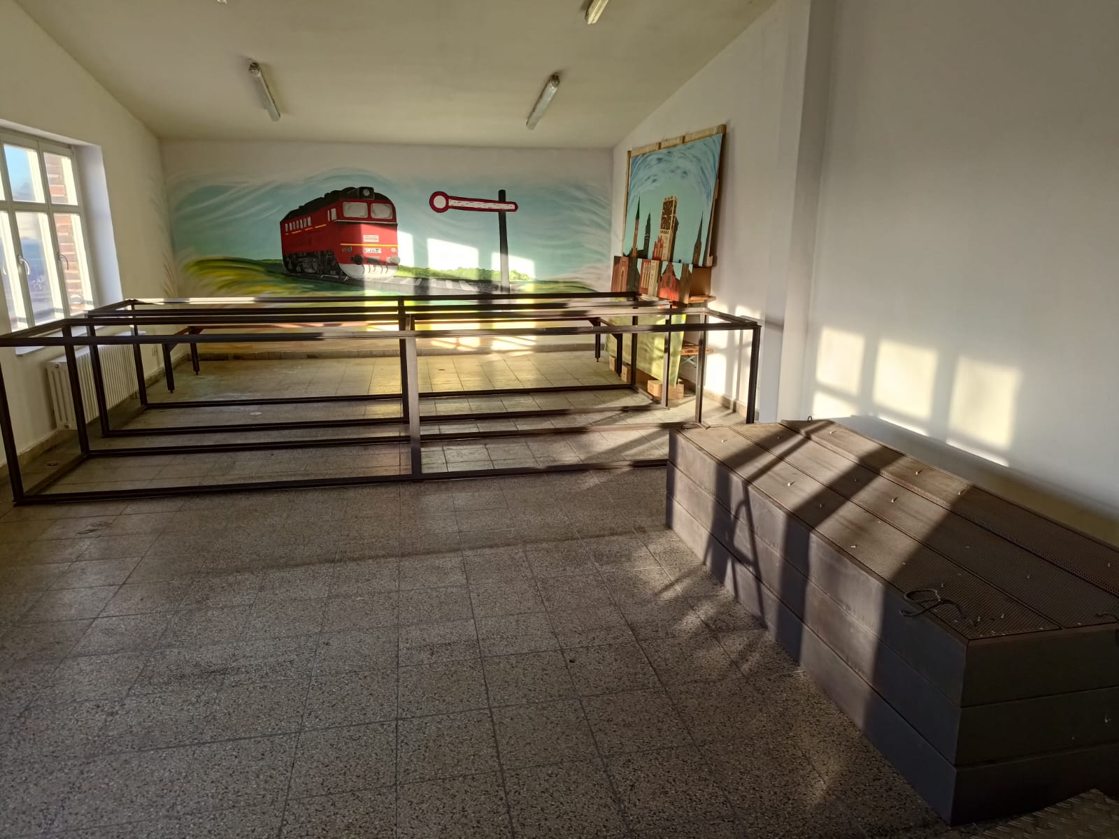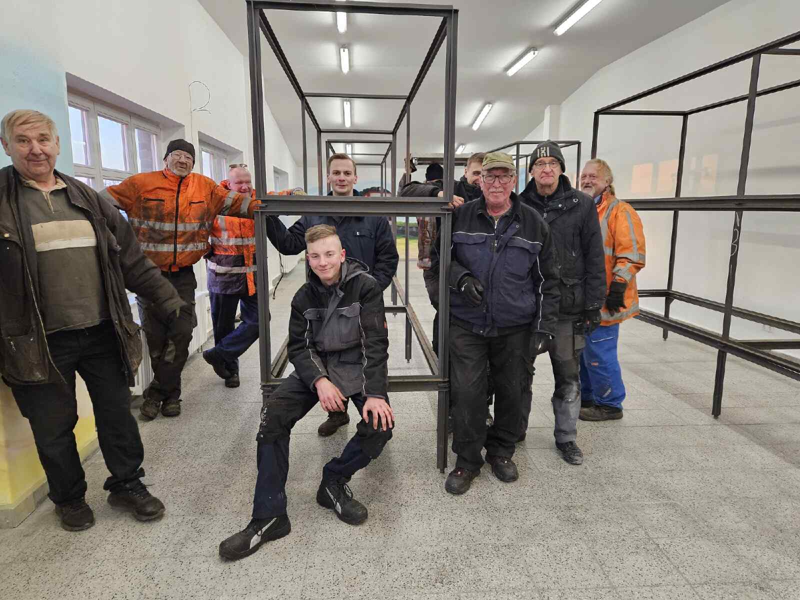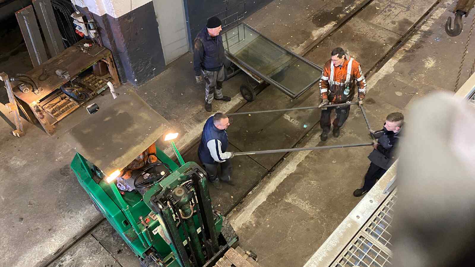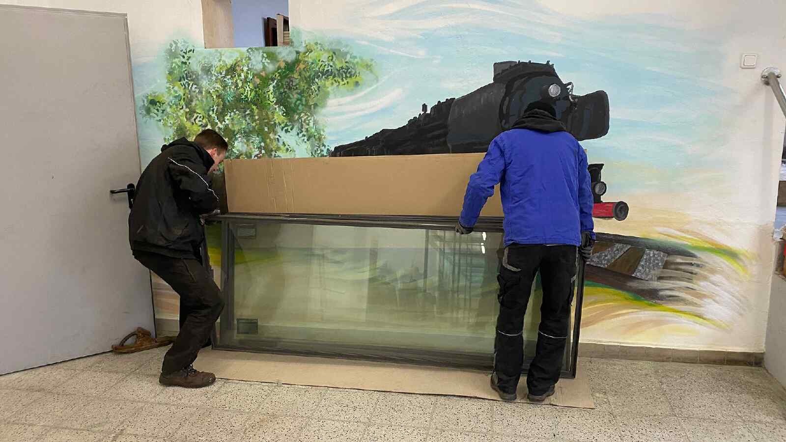 Andere Kollegen waren damit beschäftigt, die schweren Vitrinen in den neuen Ausstellungsraum im Südgiebel unseres Lokschuppens zu bringen. Da er sich in der ersten Etage befindet, mussten alle Rahmen und Glasscheiben der Vitrinen per Gabelstapler hinaufgehoben werden. Danach wurden die Rahmen dort zusammengesetzt. Die Glasscheiben werden demnächst eingebaut.