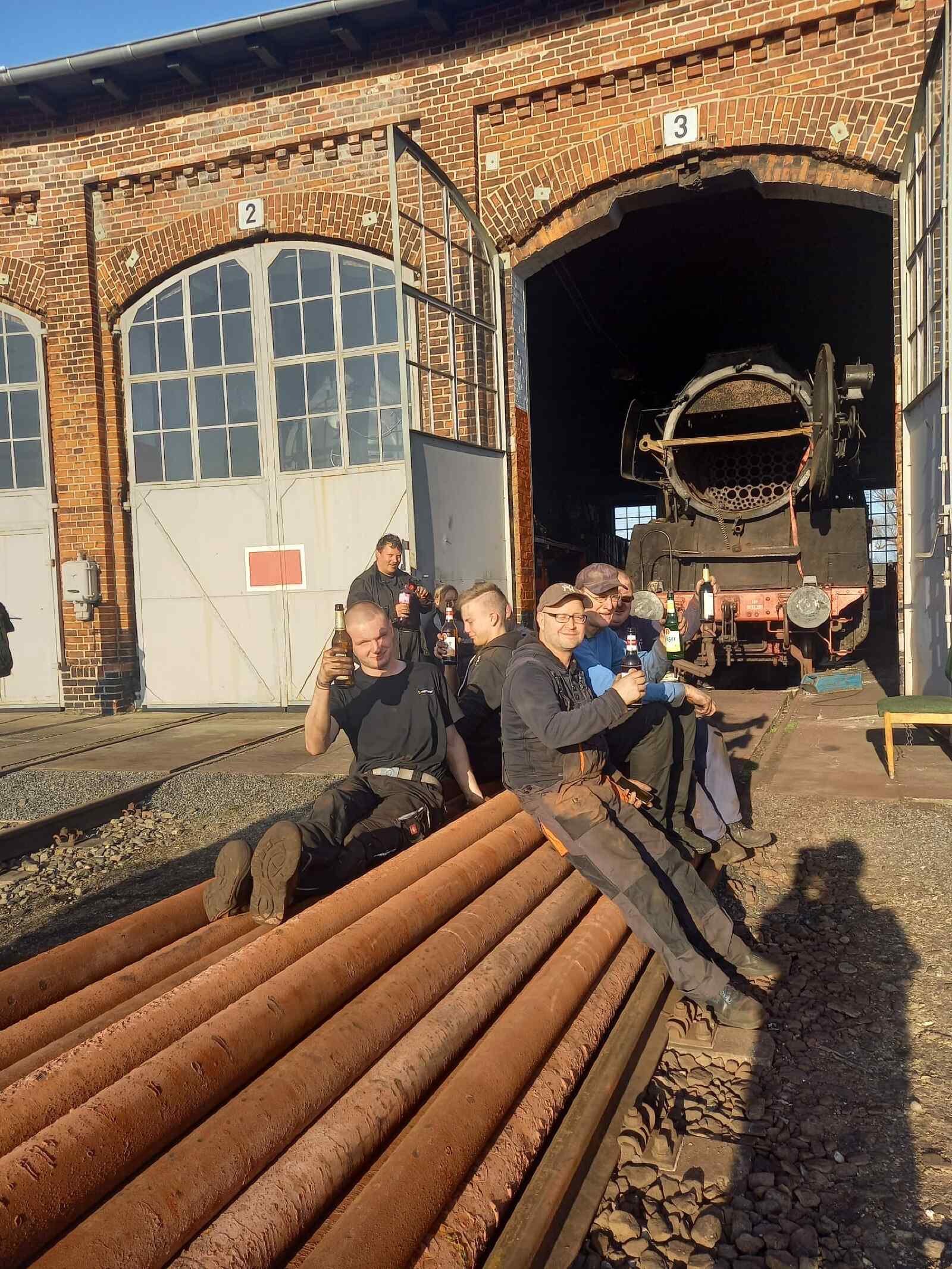 An den vergangenen Wochenenden widmeten wir uns mit Hochdruck den Arbeiten am Kessel unserer Dampflok 50 3570. Wie schon berichtet, sollten alle darin befindlichen Rohre ausgebaut und durch neue ersetzt werden. Diese Arbeit ist langwierig und dreckig und so freuen wir uns, dass diese Arbeiten nun abgeschlossen sind. Die heutigen Bilder zeigen einige Schnappschüsse von den Arbeiten. Zunächst ging es darum, die Rohre aus ihrer Verankerung zu lösen und dann aus dem Inneren des Kessels zu ziehen. Das kostet nicht nur Arbeit und Schweiß, sondern auch jede Menge Sauerstoff und Acetylen für die Schweißbrenner. Zu bedenken ist, dass die Rohre ziemlich schwer und unhandlich sind. Sie wiegen zwischen 40 und 80 Kilogramm, je nach Durchmesser. Man muss also schon bei Kräften sein, um die Arbeit zu absolvieren. Dafür schmeckt das Getränk zum Abschluss umso besser und man braucht nachher garantiert nicht mehr ins Fitness Studio.