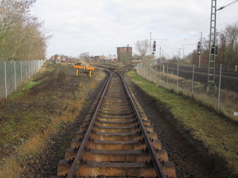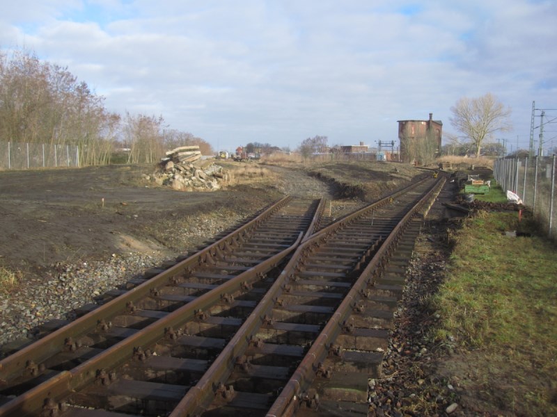 Situation in Höhe des bisherigen Endes des Gleises 31 und die gerade aufzubauende Weiche zum Gleis 32. Blick aus der Geländespitze. Anschluss zu dem Gleis, das in der Bauphase 2 in Richtung Bahnhof verlegt werden soll.