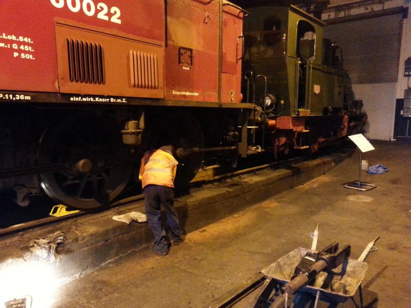 Auch an den Fahrzeugen wurde wieder gearbeitet. Zum einen erfährt die Diesellok 60022 eine große Bremsrevision, bei der alle Bremsteile ausgebaut, gereinigt, kontrolliert, gefettet und wieder eingesetzt werden. Außerdem werden neue Bremssohlen (so nennt man die Bremsbeläge von Eisenbahnfahrzeugen) eingebaut.