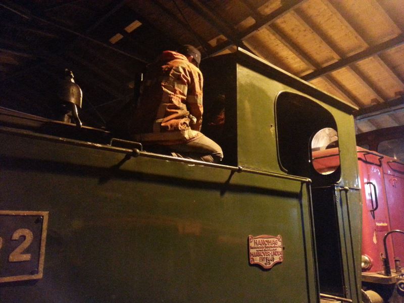 Außerdem wurden die Frontscheiben der Dampflok Emma ausgebaut. Im Laufe der Zeit hatten die Scheiben in den Fensterrahmen etwas gelöst und klapperten nun während der Fahrt bei jedem Schienenstoß. Um den Fahrkomfort wieder zu erhöhen, wurden sie neu eingedichtet.