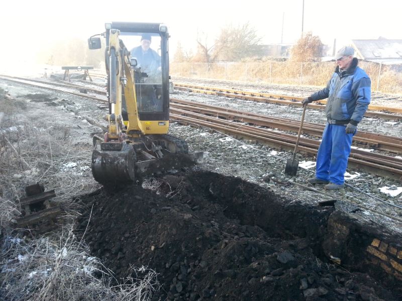 Die Bauarbeiten an unserem Lokschuppengleis 1 wurden fortgesetzt. Heute ging es darum, die hölzernen Längsschwellen zu entfernen, die vor mehr als hundert Jahren eingebaut wurden, um die Schienen des Gleises zu tragen. Inzwischen sind sie stellenweise sehr verrottet. Allerdings „wehrten“ sie sich noch gegen den Ausbau, da sie fest mit den Ziegelfundamenten (im folgenden Bild rechts und links in der Grube zu erkennen) verschraubt waren. Auf dem folgenden Bild sind die Reste einer solchen Längsschwelle zu erkennen.