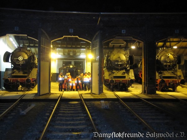Der Verein hat einen großen Meilenstein beim Umzug nach Wittenberge geschafft! Alle streckengängigen Fahrzeuge wurden bis Ende Oktober 2012 auf eigener Achse von Salzwedel über Stendal nach Wittenberge überführt. Dabei hat sich die gute Vorbereitung beim Herstellen der Lauffähigkeiten der Fahrzeuge bezahlt gemacht. Alle immerhin fünf Züge haben ohne Störung ihr Ziel erreicht. Den Beteiligten fiel trotzdem nach jeder Fahrt so mancher Stein vom Herz und so sammelte man sich zu einem Erinnerungsfoto vor einigen großen Exponaten in der neuen Heimat Wittenberge