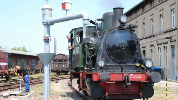 Martina Kasprzak "Seit vergangener Woche haben wir auch den Wasserkran. In den Monaten zuvor haben wir eine 300 Meter lange Rohrleitung zum Wasserturm verlegt", erklärte der Vorsitzende der Dampflokfreunde Salzwedel, Burkhard Bohn. Und am Wochenende konnten die zahlreichen Besucher im Historischen Lokschuppen Wittenberge – an beiden Tagen waren es trotz der brütenden Hitze gut 500 – live mit ansehen, wie die Dampfloks mit Wasser aus dem Kran befüllt werden. Die kleine Emma, auf der die Besucher mitfahren durften, fasst an die sechs Kubikmeter Wasser. Sie wurde morgens und mittags befüllt. Die großen Loks benötigen um die 26 bis 28 Kubikmeter.