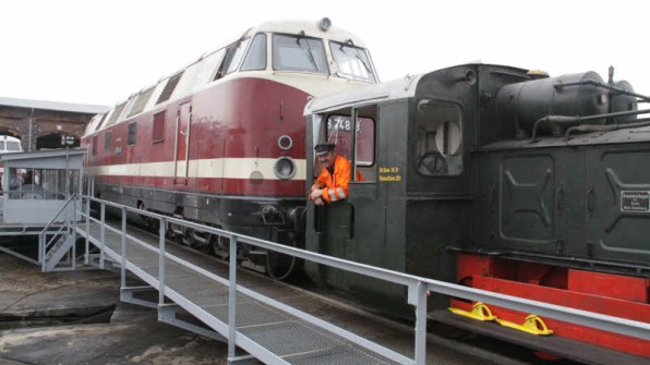 Die kleine Diesellok zieht das neue Museumsstück – die „Dicke Babelsbergerin“ auf die Drehscheibe, im Führerhaus Dirk Endisch.