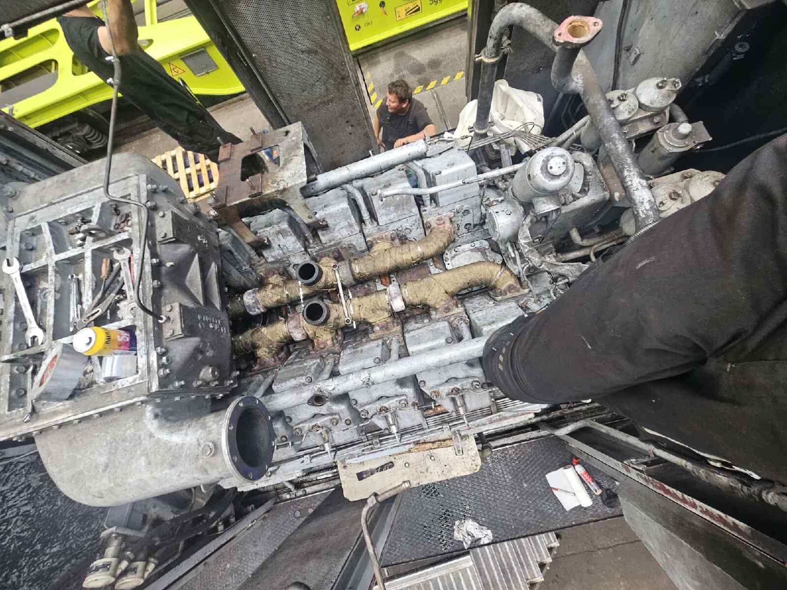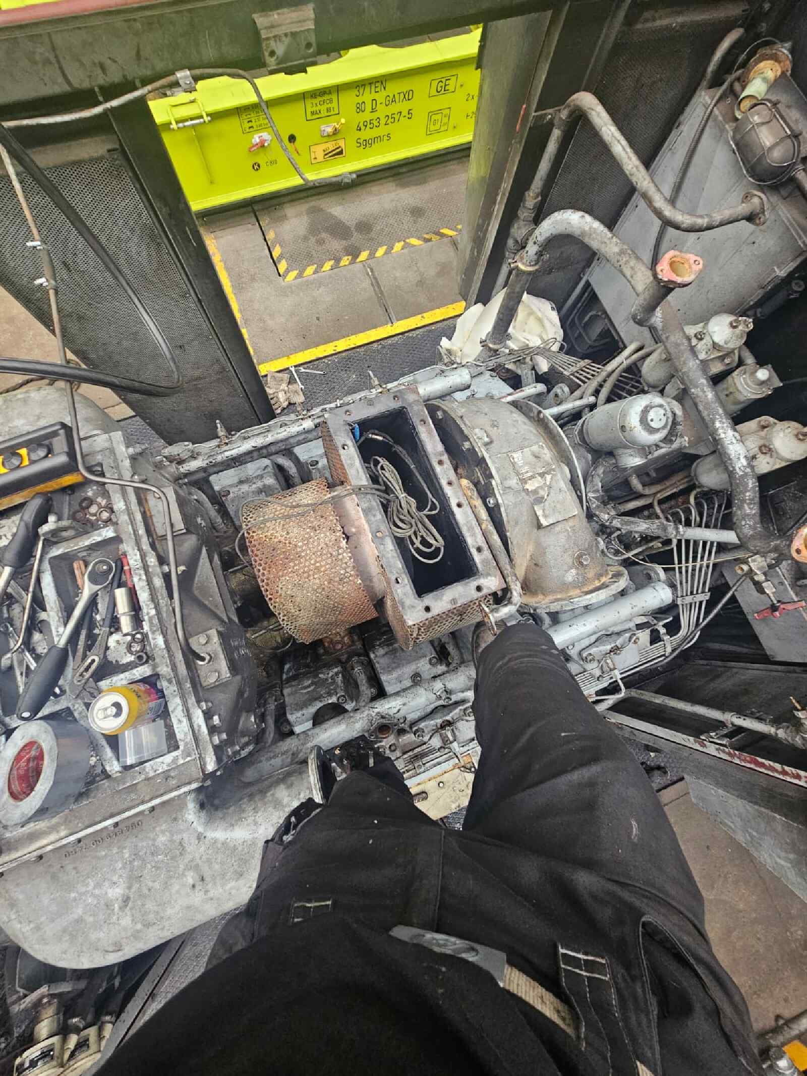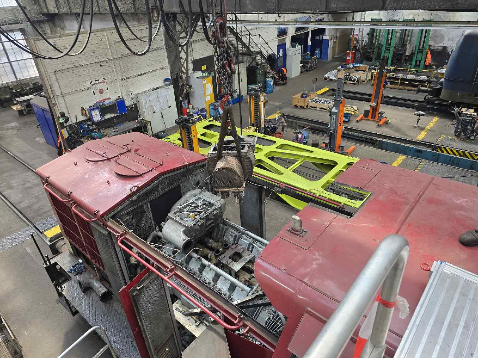 Zwar war unser Motor seit der letzten großen Instandsetzung vor einigen Jahren nur ein paar Dutzend Betriebsstunden gelaufen. Allerdings waren im Laufe der langen Standzeit seit der Abstellung der Lok durch den letzten kommerziellen Eigentümer einige Undichtigkeiten am Turbolader aufgetreten, die zum Austritt von Öl führte. Bevor wir die Lok wieder einsetzen können, mussten diese Undichtigkeiten beseitigt werden. Dazu wurde der Turbolader und diverse andere Anbauteile aus dem Motorraum entfernt, um sie aufarbeiten zu können.