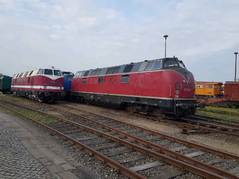 Außerdem steuerte die Eisenbahngesellschaft Potsdam noch einige Exponate für die Lokausstellung im Außengelände bei. Vielen Dank nochmal dafür! Im folgenden Bild erkennt man in dunkelroter Lackierung die Diesellok 221 145 der ehemaligen Deutschen Bundesbahn neben ihrer Schwester 118 692 der Deutschen Reichsbahn.