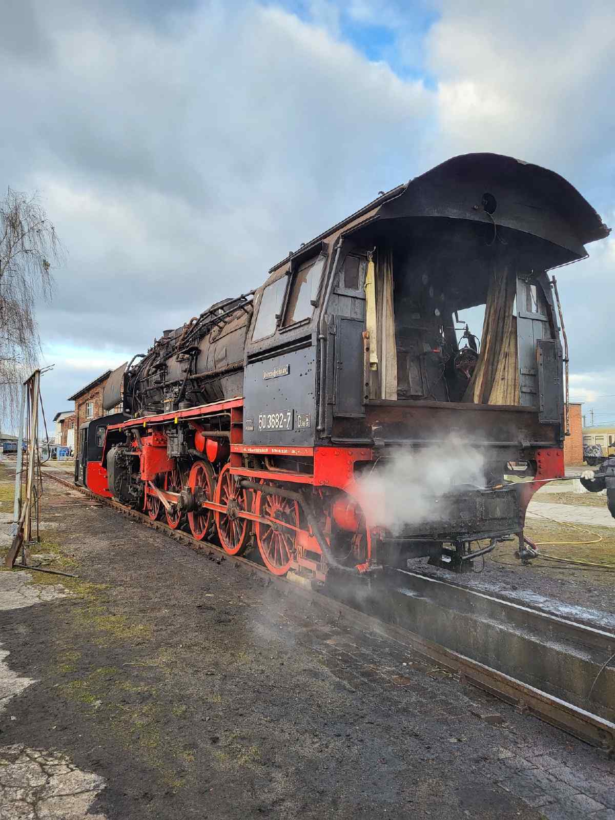 Am vergangenen Samstag haben unsere Dampfloks 50 3570 und 3682 etwas Frühlingsluft schnuppern dürfen. Wir haben sie nämlich auf das Gleis neben dem Lokschuppen rangiert, um sie mit einem Hochdruckreiniger zu säubern. Wegen der Größe der Lokomotiven hat das mehrere Kollegen mehrere Stunden lang beschäftigt.
