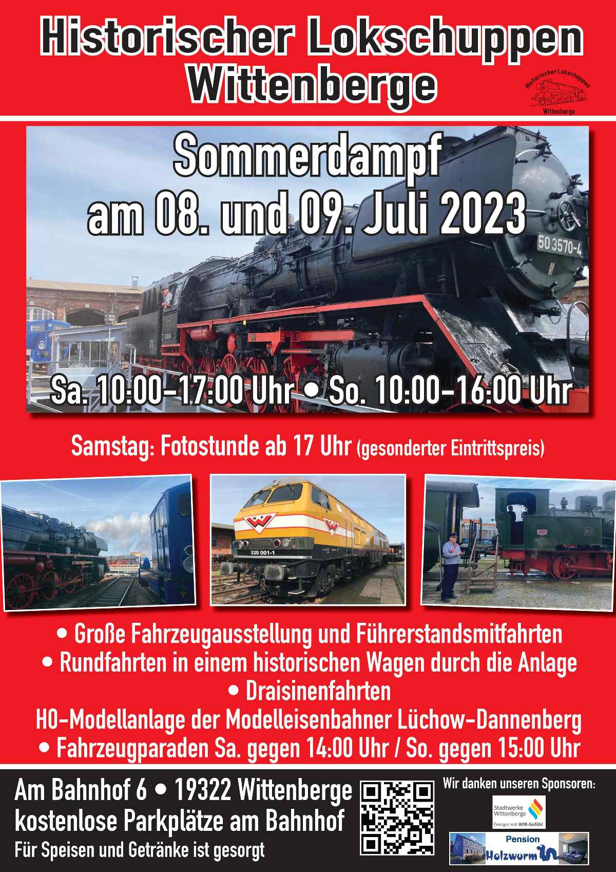 Wie Sie, liebe Leser unseres Newsletters, bestimmt schon wissen, findet am 8. und 9.7.2023 das Sommerfest im Historischen Lokschuppen Wittenberge statt. Einige von Ihnen, die in anderen Bundesländern wohnen, haben sich vielleicht auch schon den Termin reserviert, weil Sie auf Ihrer Reise in den Urlaub an der Ostsee oder an der Mecklenburgischen Seenplatte bei uns Station machen. Wir freuen uns auf Sie und alle anderen, die extra den einen mehr oder weniger weiten Weg zu uns machen, um mit uns gemeinsam eine Menge Eisenbahn zu erleben.