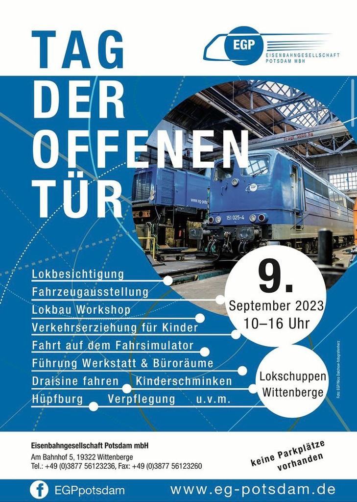 Am 9.9.2023 veranstalten unsere Nachbarn, die Eisenbahngesellschaft Potsdam, einen Tag der offenen Tür ab 10:00 Uhr. In der unserem Museum benachbarten Werkstatt können Sie ausnahmsweise einmal hinter die Kulissen schauen.