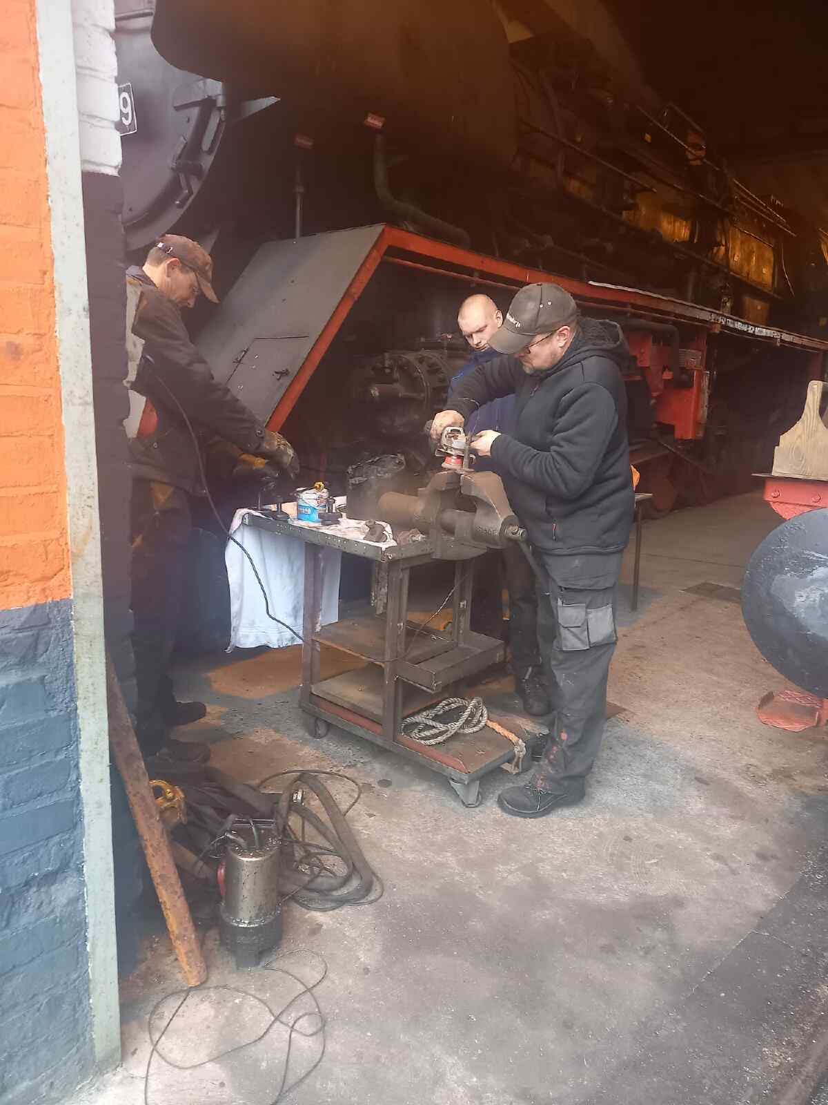 Dazu gehören insbesondere Arbeiten an unserer Dampflok 50 3570, die wir gerne im nächsten Jahr wieder betriebsfähig vorführen möchten. Dafür müssen wir etliche Arbeiten erledigen, die ziemlich zeitintensiv sind. Dazu gehört insbesondere die Kesselreparatur, die nun vorbereitet wird. Am vergangenen Samstag wurden einige Kräfte gebündelt, um den Kessel auszuwaschen. Dazu wurden alle Waschluken entfernt. Dabei handelt es sich um pilzförmige Verschlüsse, die kleine ovale Öffnungen in der Kesselwand abdichten, durch die man mit einem starken Wasserstrahl Verunreinigungen und Kalkrückstände aus dem Kessel herausspülen kann. Da die Muttern, die die Verschlüsse halten, manchmal extrem festsitzen, muss man sie teilweise mit einer Flamme rotglühend erhitzen, damit sie sich etwas ausdehnen und man sie lösen kann.