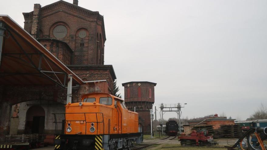 Der Wasserturm (hinten) und die Wasserstation auf dem Gelände des historischen Lokschuppens